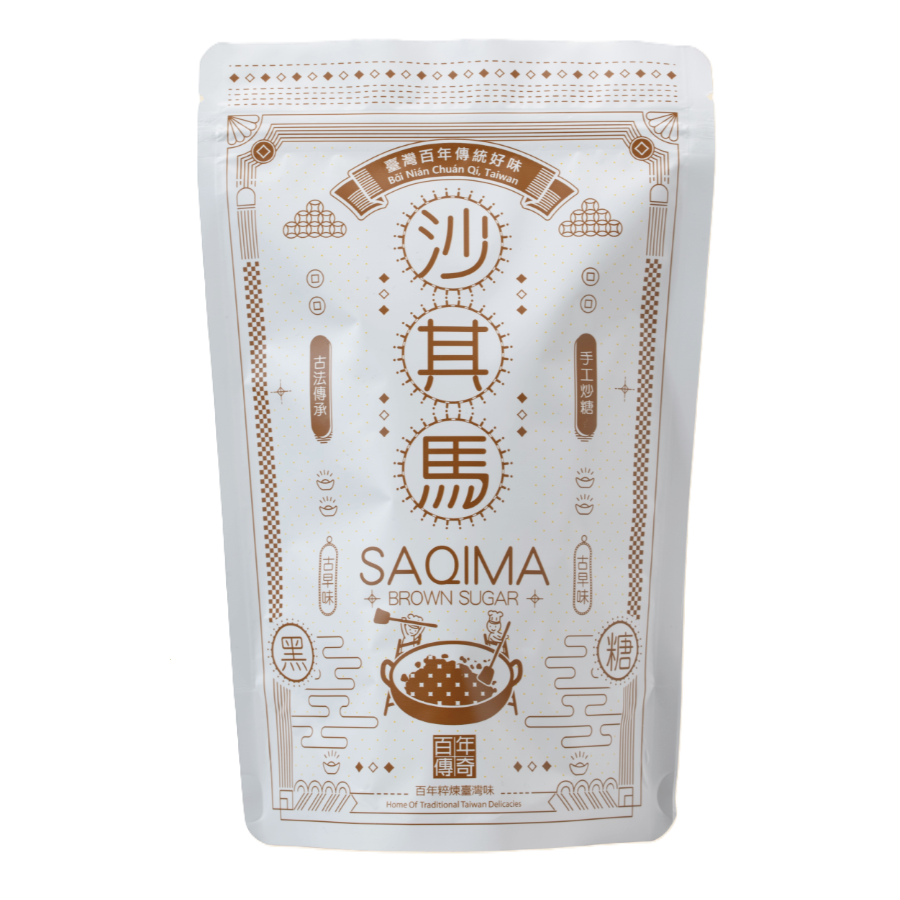 百年傳奇,致力於潔淨標示,歷時兩年測試,最終選定有別於市售黑糖之濃郁香氣,只有淡淡的蔗香味及絲絲焦香的「台南飛龍原香糖」,長時間低溫發酵換取酥脆口感,黑糖取代白糖製作麵糰入口酥脆,全程古法手工製作,不含任何添加物,古早味黑糖沙其馬就此誕生。