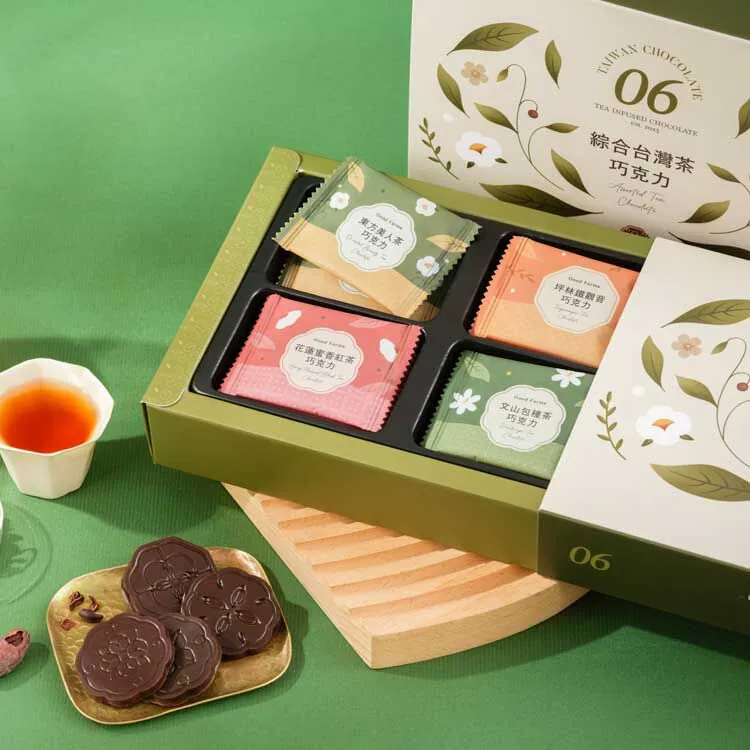 ●低糖、無添加、純可可製成的茶香巧克力。 ●文山包種茶、花蓮蜜香紅茶、坪林鐵觀音、東方美人,四款茶香風味。 ●綜合口味,簡約精緻包裝,送禮自用都合適。 ※巧克力商品需置於陰暗乾燥處或低溫保存,為避免運輸途中融化,如有需求之顧客,請向實體店面洽詢。