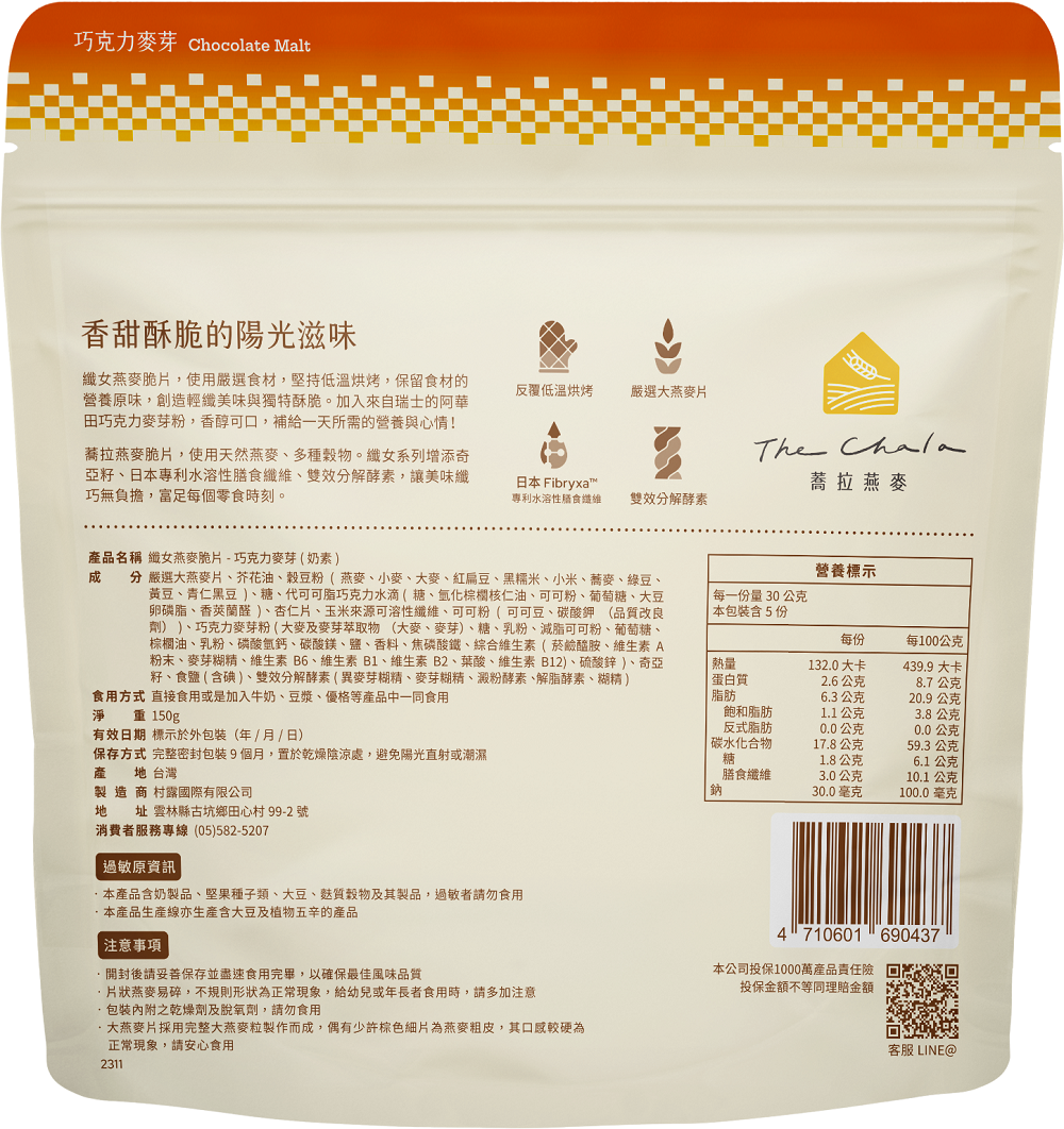 蕎拉燕麥堅持使用嚴選大燕麥片、精選萃取植物油,並使用高認證標準的黃金黑糖、